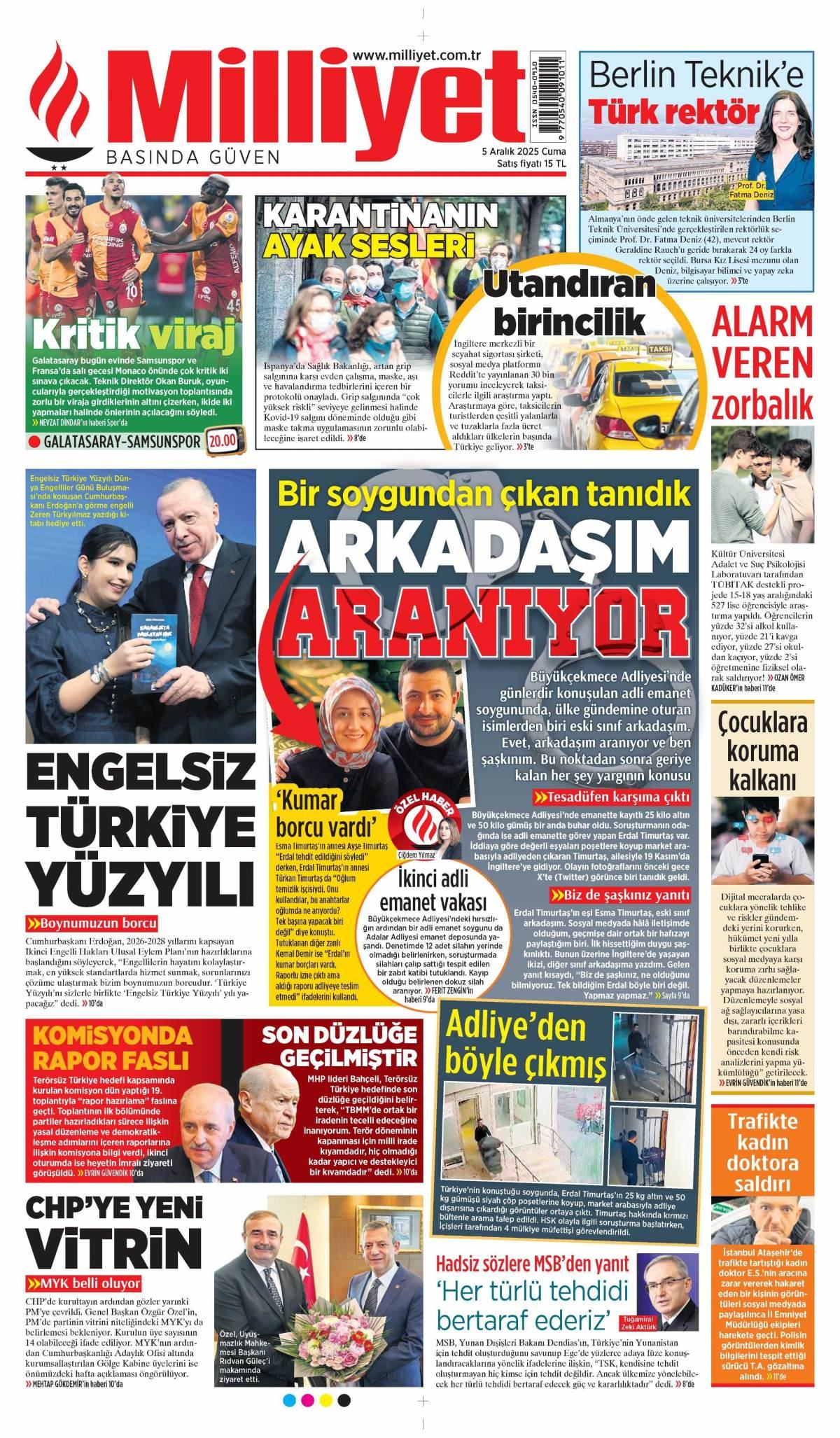 Milliyet Gazetesi 6 Aralık 2025 Günü Manşeti