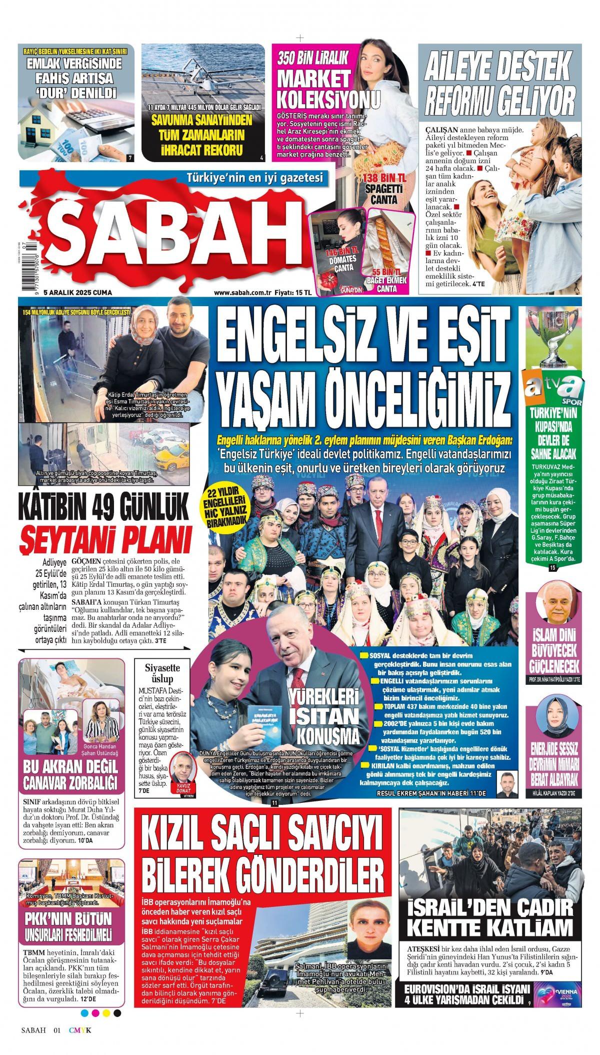 Sabah Gazetesi 6 Aralık 2025 Günü Manşeti